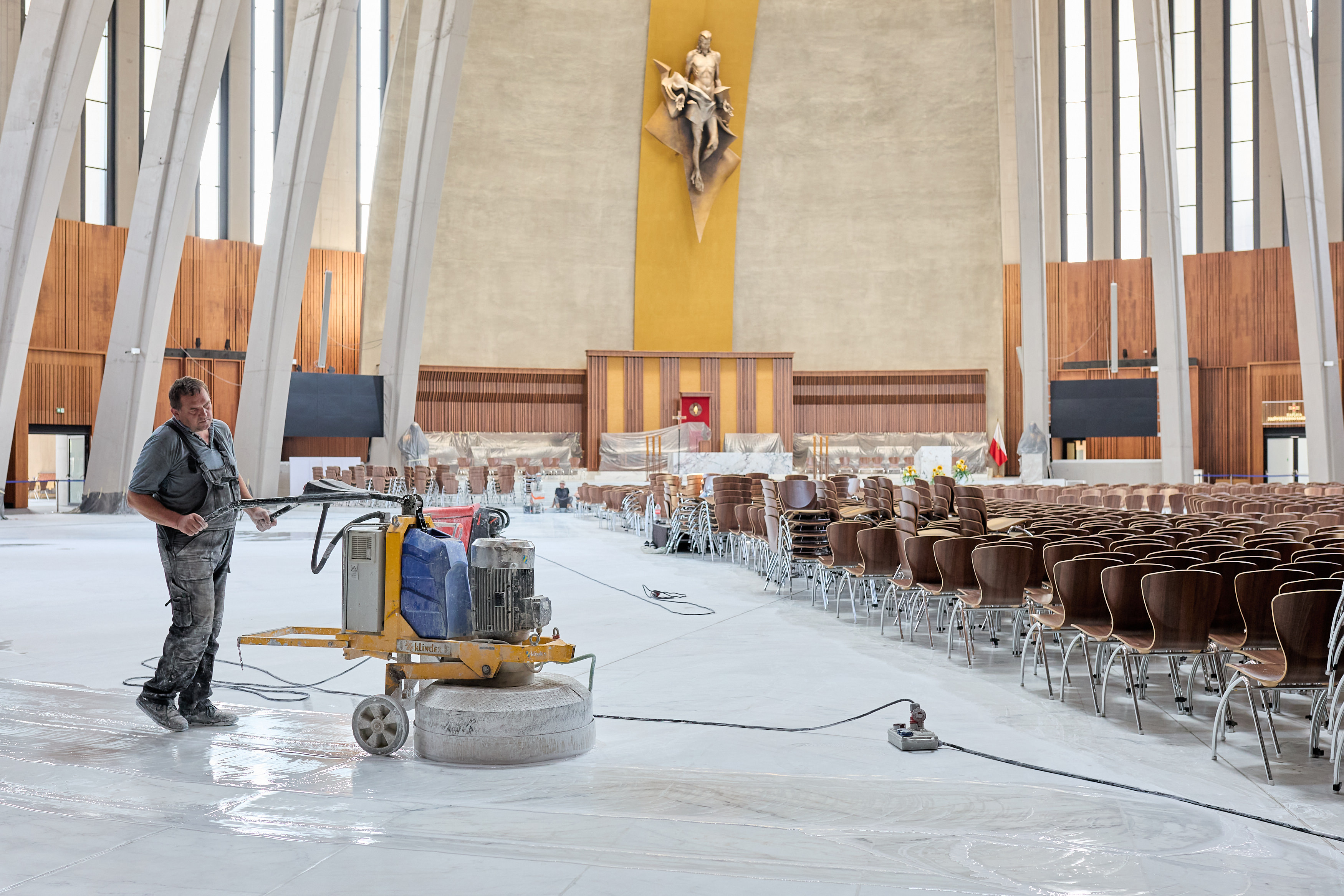 Rok 2024 upłynął pod znakiem prac w prezbiterium oraz nawie głównej Świątyni. Jednym z największych wyzwań było szlifowanie posadzki, które trwało od lipca do października. Wymagało ono precyzji i staranności, ale efekt jest imponujący. Zadanie powierzono Przedsiębiorstwu Kamieniarskiemu „Wolski”, które podjęło się tego zlecenia we współpracy z firmą MarArt, specjalizującą się w renowacji posadzek metodami kamieniarskimi. Nowoczesne szlifierki włoskiej firmy Klindex, jedne z największych i najmocniejszych w Europie, w kilku etapach szlifowania i polerowania nadały marmurowi Calacatta Lincoln nowy blask. Tarcze diamentowe pozwoliły uzyskać lustrzany efekt. Dzięki zastosowaniu techniki krystalizacji chemicznej ułożona osiem lat temu w nawie głównej posadzka uzyskała głębszy kolor, wyższy połysk oraz twardość, zwiększającą nawet ośmiokrotnie odporność na zabrudzenia i zarysowania. Prace te objęły powierzchnię 2100 metrów kwadratowych.