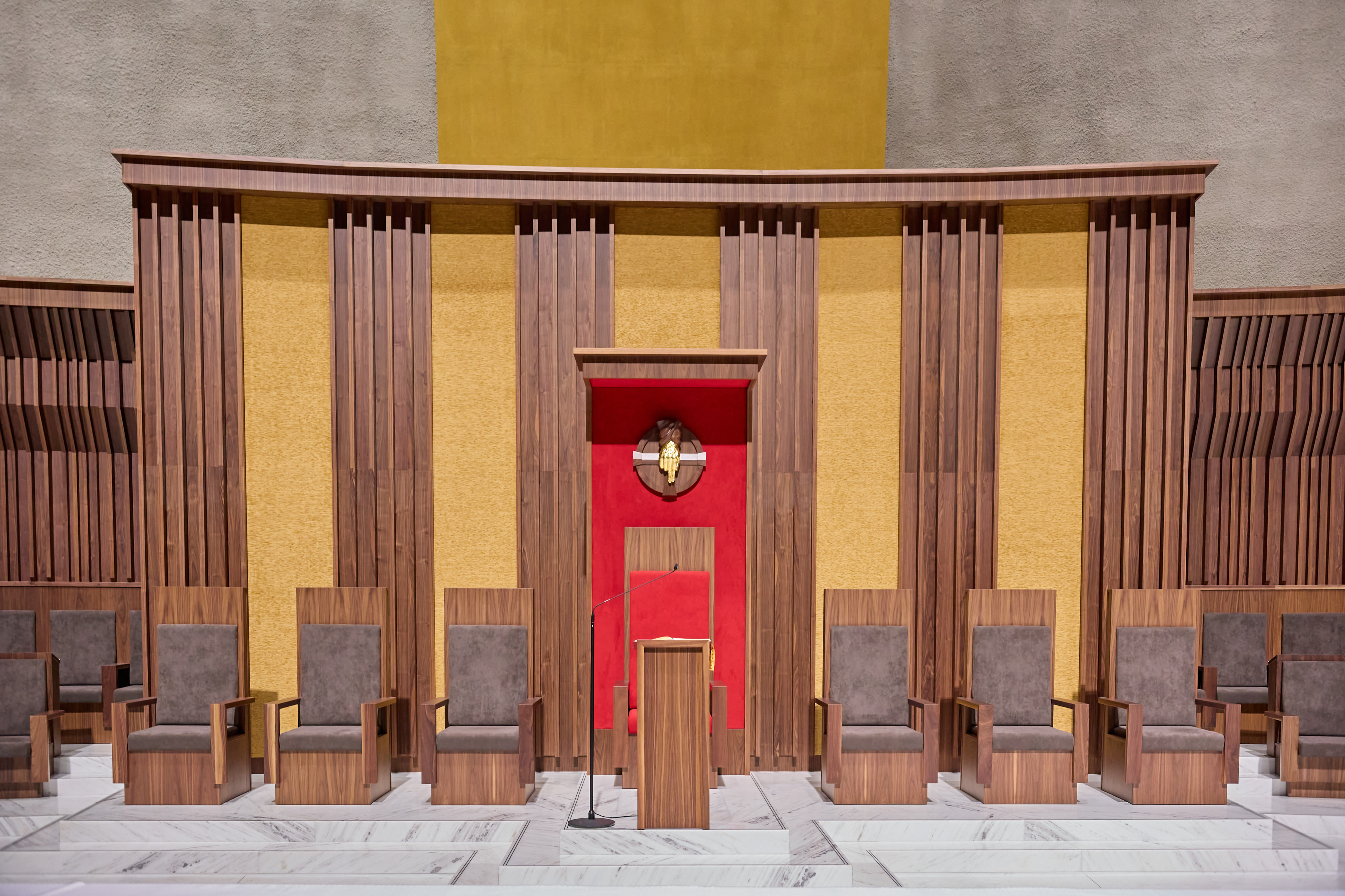 Z radością możemy ogłosić, że dobiegły końca prace w prezbiterium. Ogromu wyzwań związanych z umieszczeniem na ścianie ołtarzowej figury Chrystusa Zmartwychwstałego w 2023 roku oraz aranżacją miejsca przewodniczenia dopełniły w tym roku: montaż drugiego rzędu stalli, zabudowa akustyczna pod telebimami oraz umieszczenie wykonanych przez prof. Adama Myjaka rzeźb św. Jana Pawła II i bł. Stefana Wyszyńskiego. Odlane z brązu popiersia Mężów Opatrzności – papieża Polaka i Prymasa Tysiąclecia, którym Polska zawdzięcza duchową odnowę, a świat wyzwolenie z pęt komunistycznego zniewolenia – stanęły częściowo na schodach prezbiterium, zamykając symbolicznie pochód świętych i błogosławionych biegnący wzdłuż nawy bocznej, w której umieszczone są ich relikwie, aż do nawy głównej. Nowe rzeźby zostały poświęcone podczas Eucharystii XVII Święta Dziękczynienia, 2 czerwca.