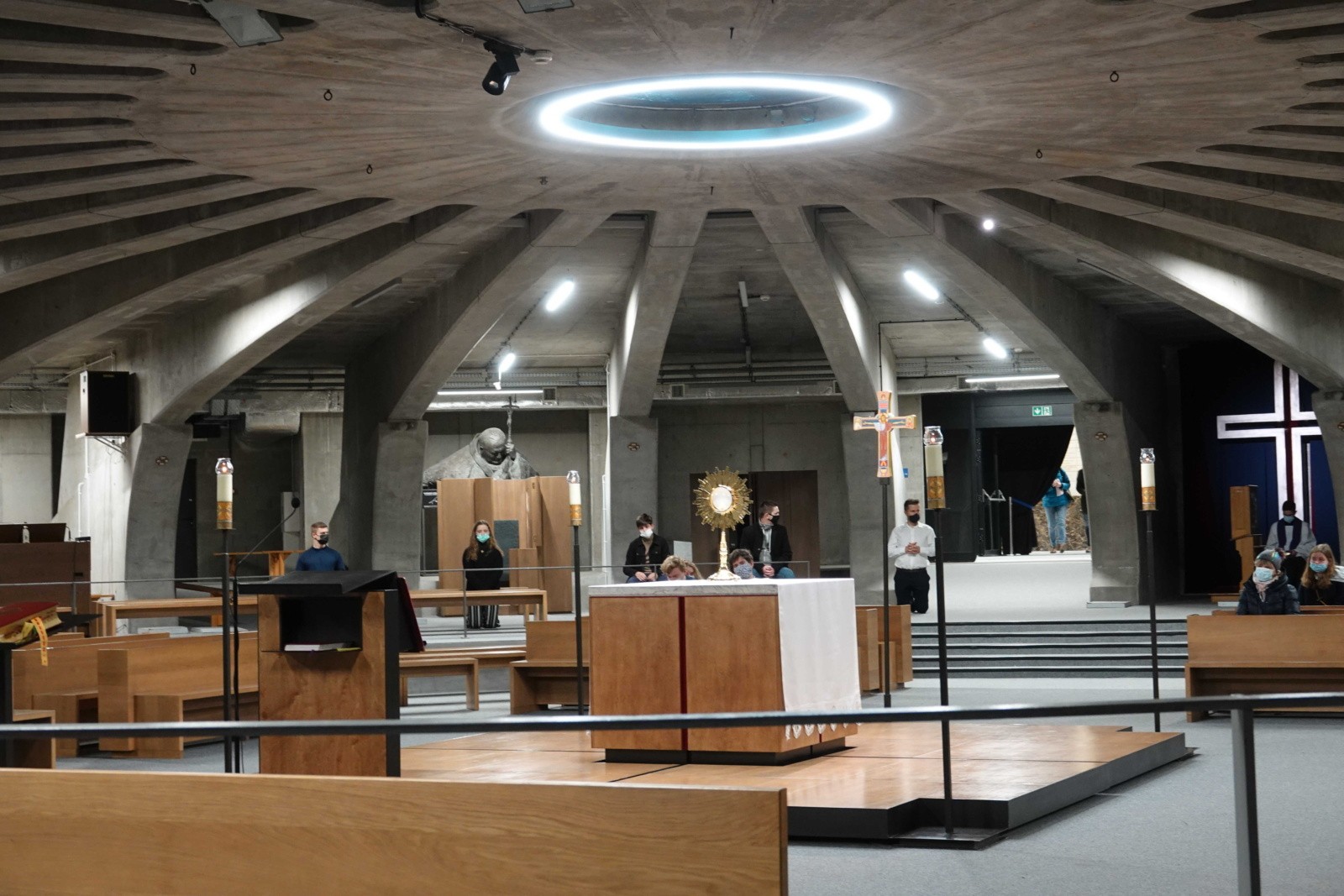 Diecezjalne Spotkanie Młodych 2021W tym czasie w dolnej części Świątyni, przy wystawionym Najświętszym Sakramencie, księża czekali na młodych w konfesjonałach.