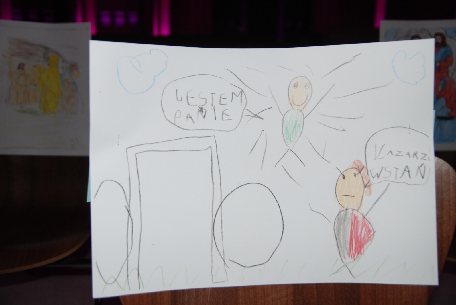 i starsze dzieci. Czasem nieporadne, ale tym bardziej wywołujące zachwyt i wzruszenie. Tak jak ten pełen ekspresji rysunek ilustrujący wskrzeszenie Łazarza.