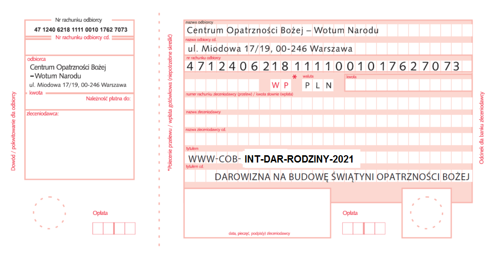 Poniżej numer rachunku bankowego, na który można wpłacać darowizny na rzecz budowy Świątyni Opatrzności Bożej: