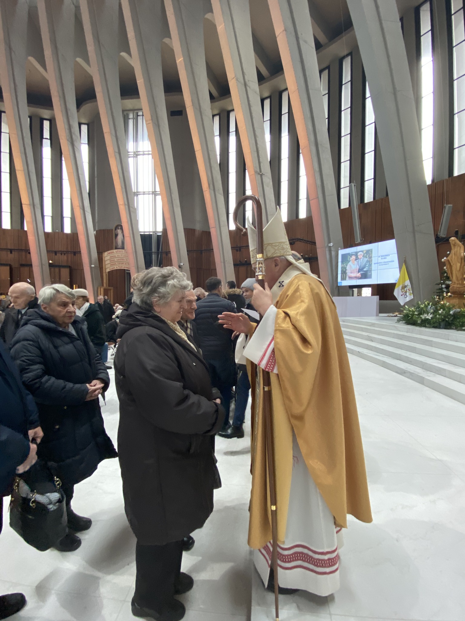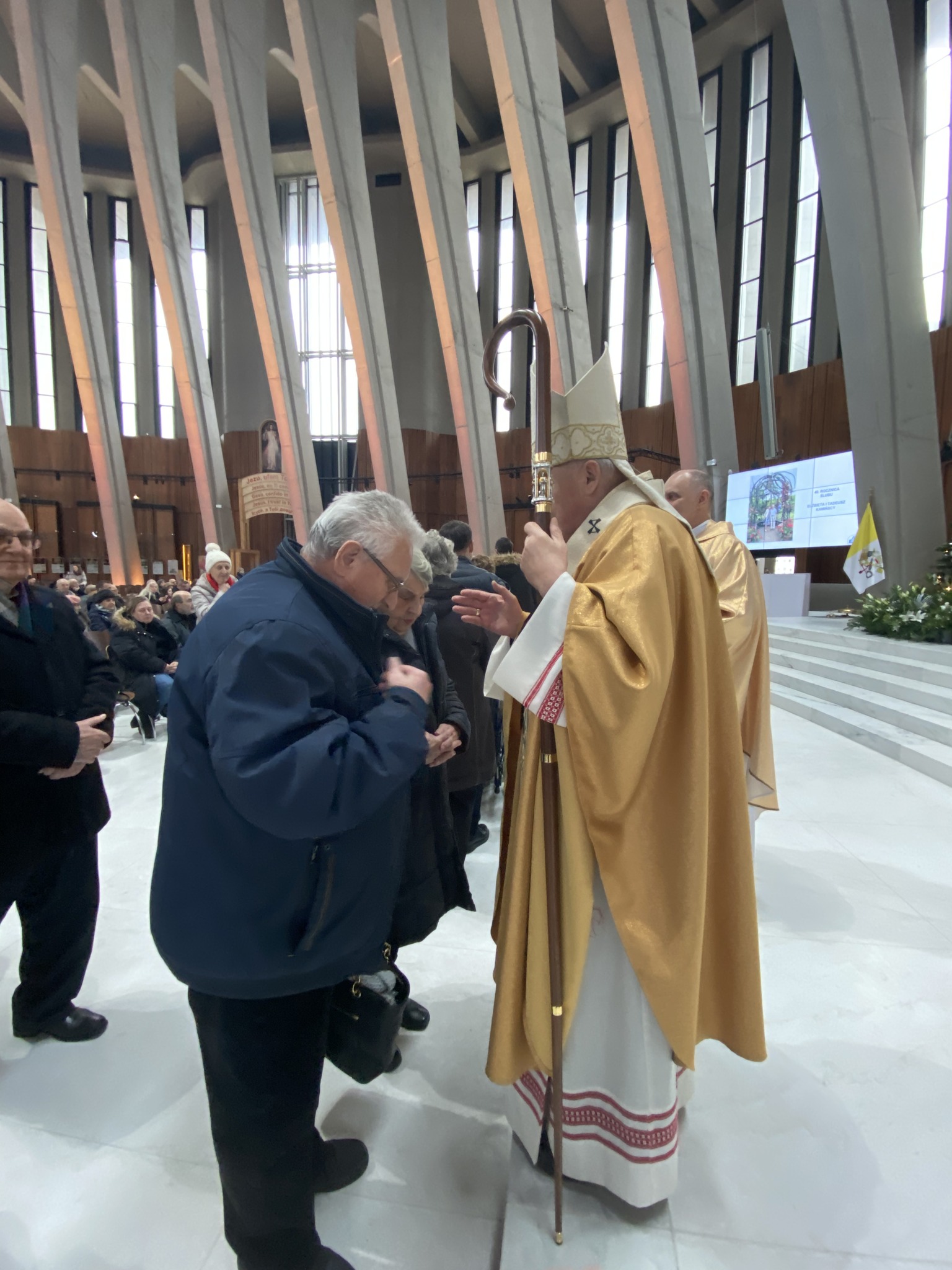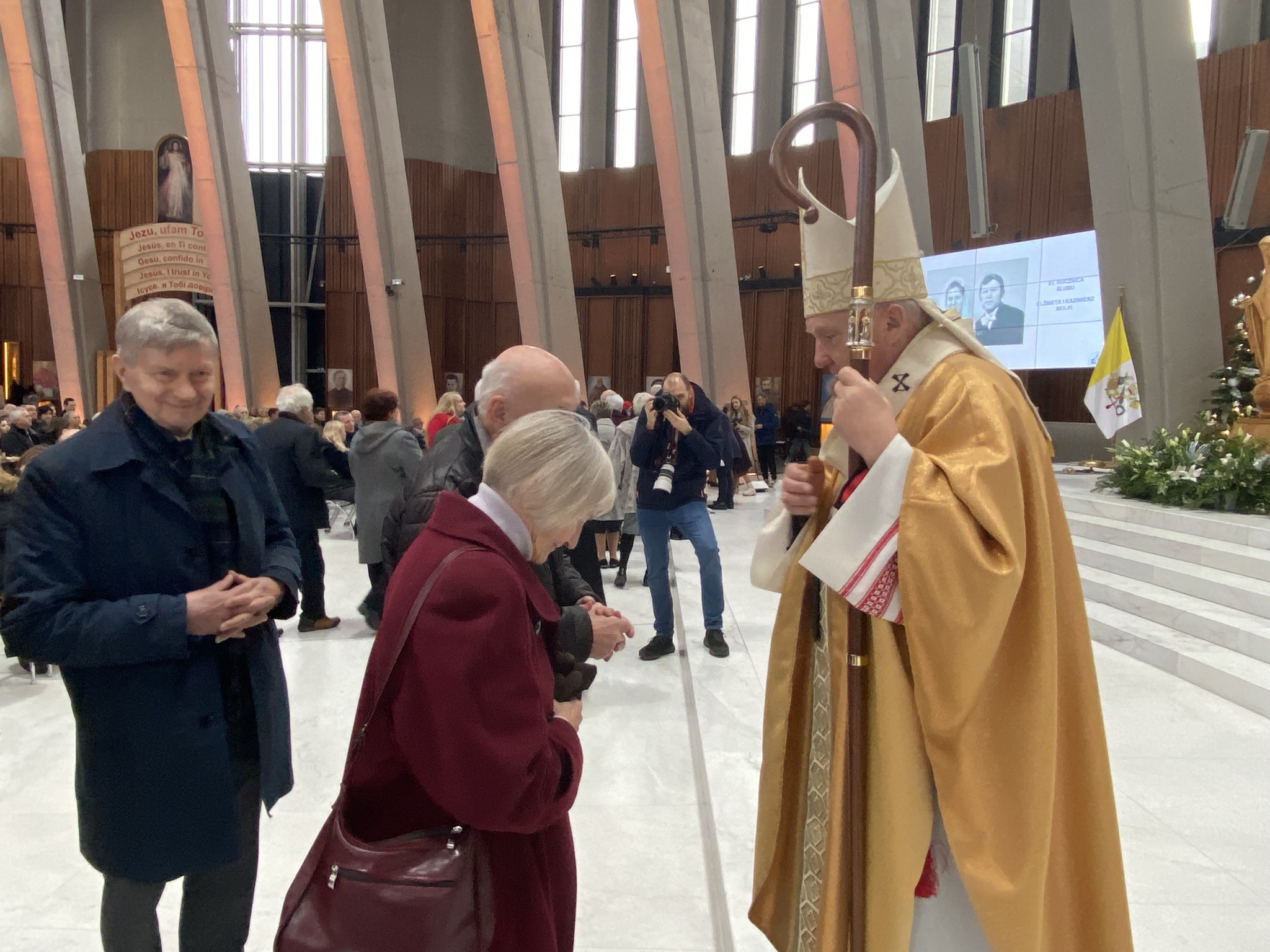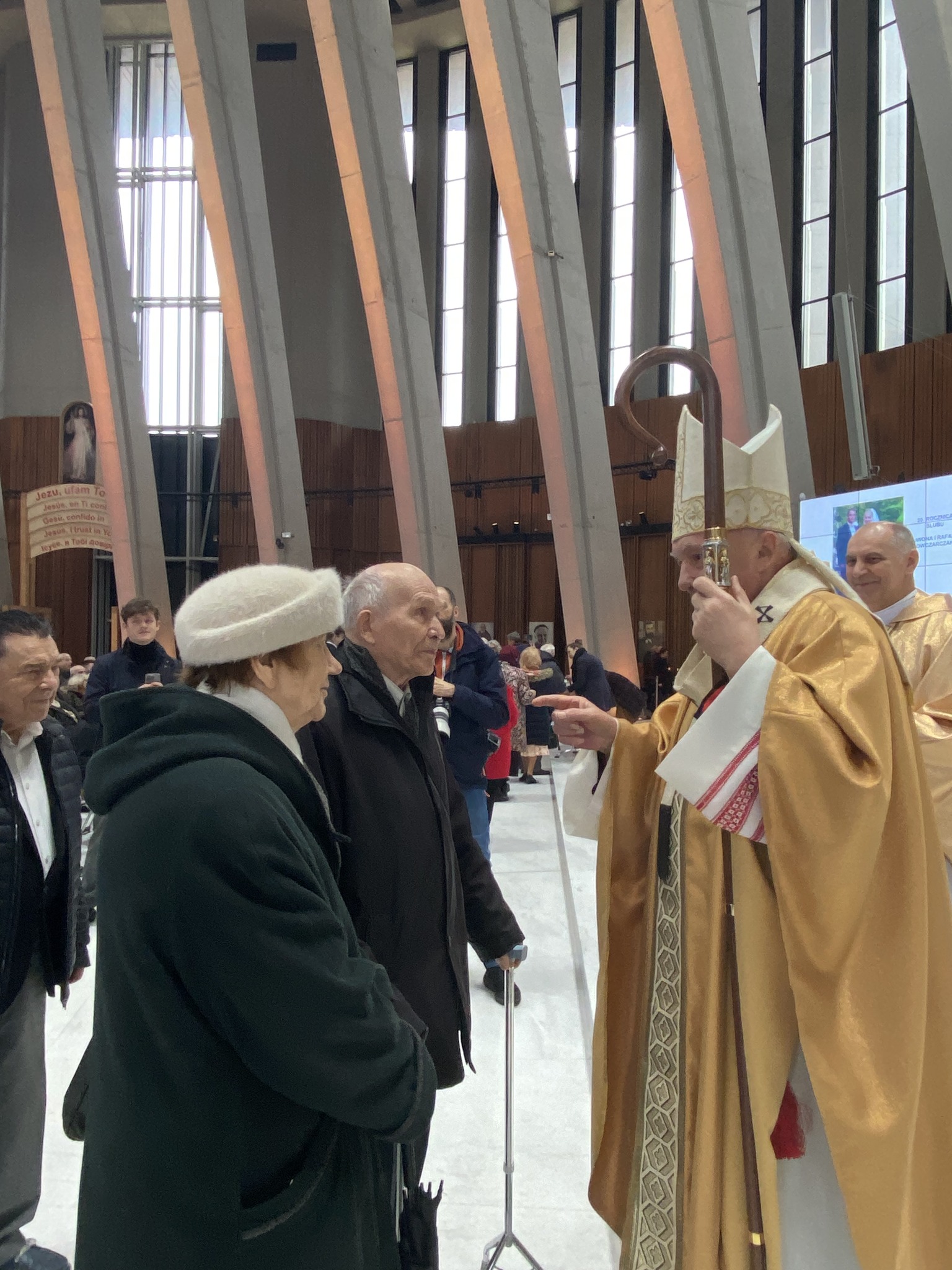 Po zakończeniu uroczystej Eucharystii małżonkowie od najstarszych z 70-letnim stażem aż do najmłodszych 5-latków, wyczytywani przez ks. Tadeusza Aleksandrowicza, kustosza wilanowskiego Sanktuarium ustawili się w długim orszaku par zmierzających do ołtarza. Tu kardynał Kazimierz Nycz udzielał każdej z par pasterskiego błogosławieństwa. Następnie małżonkowie odbierali pamiątkowe dyplomy, znak swojego wyjątkowego jubileuszu w roku 2023 w Świątyni Opatrzności Bożej.