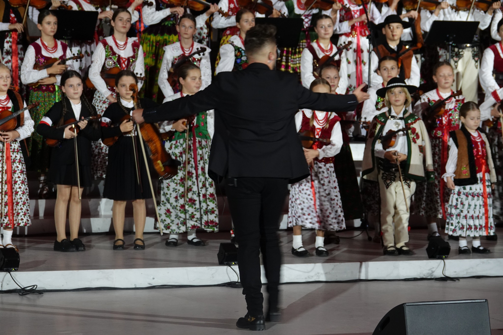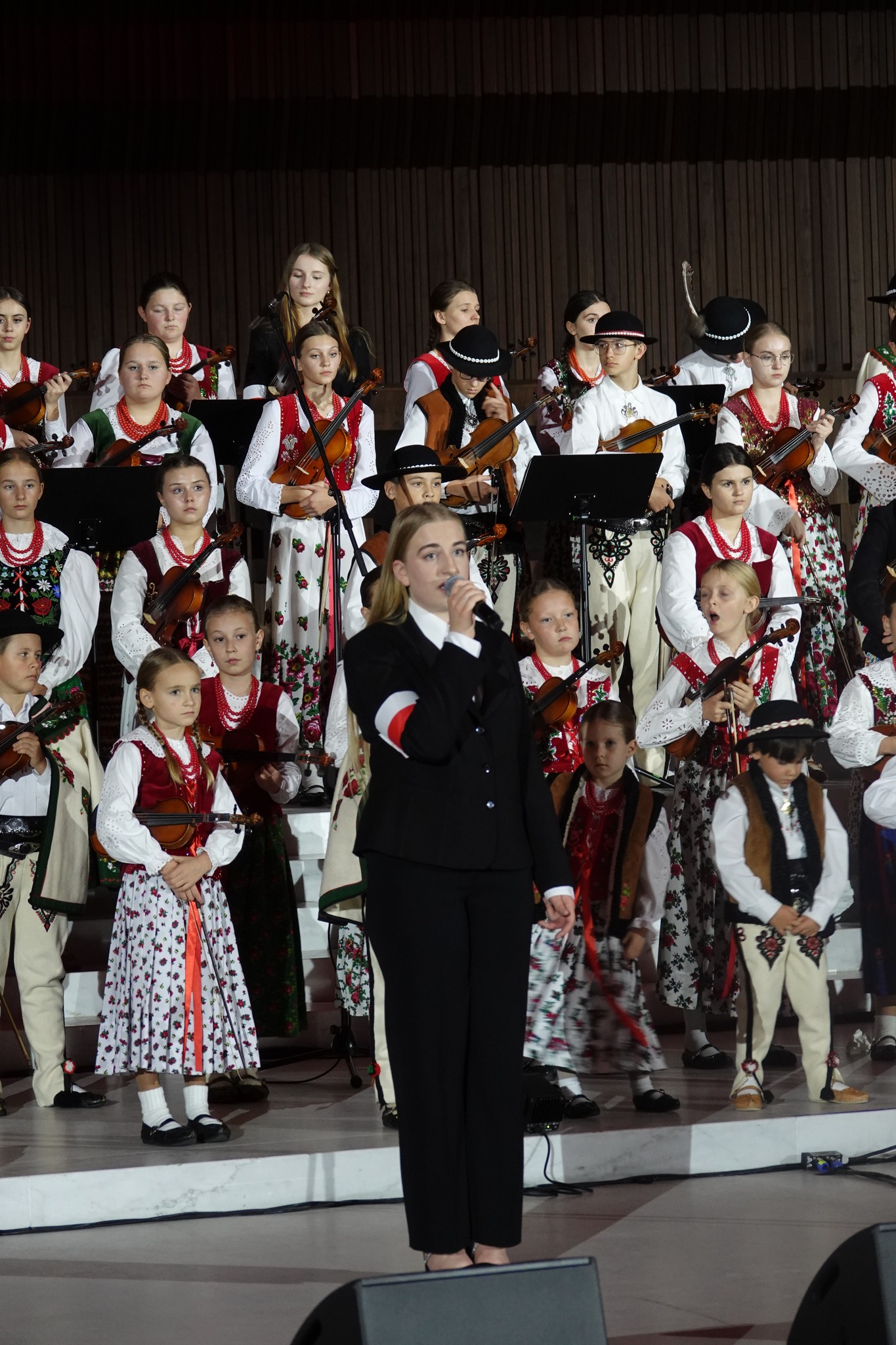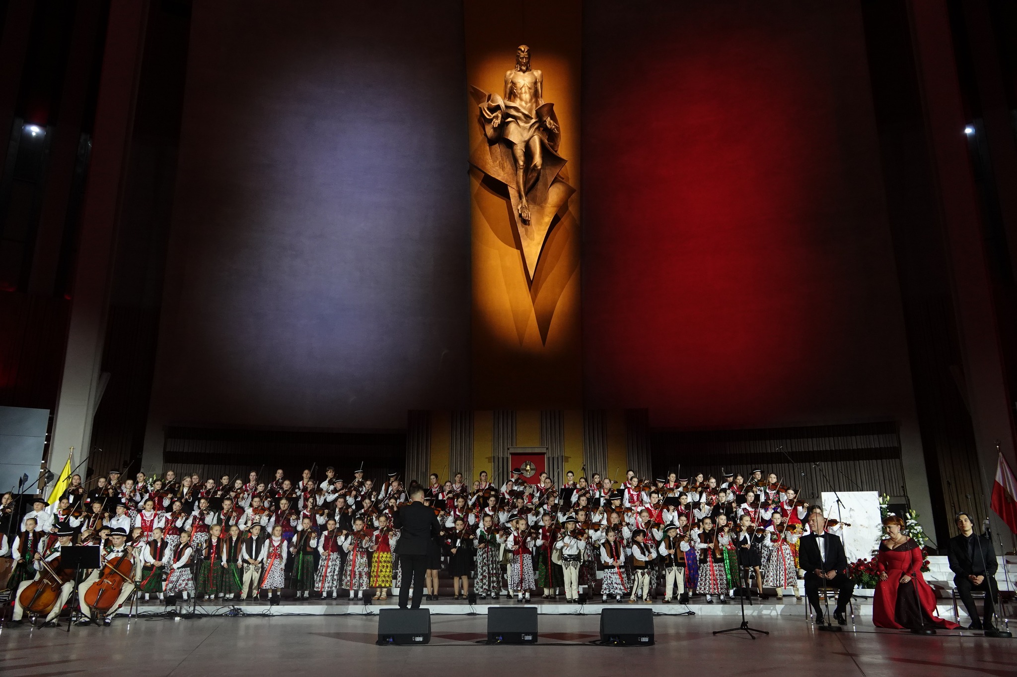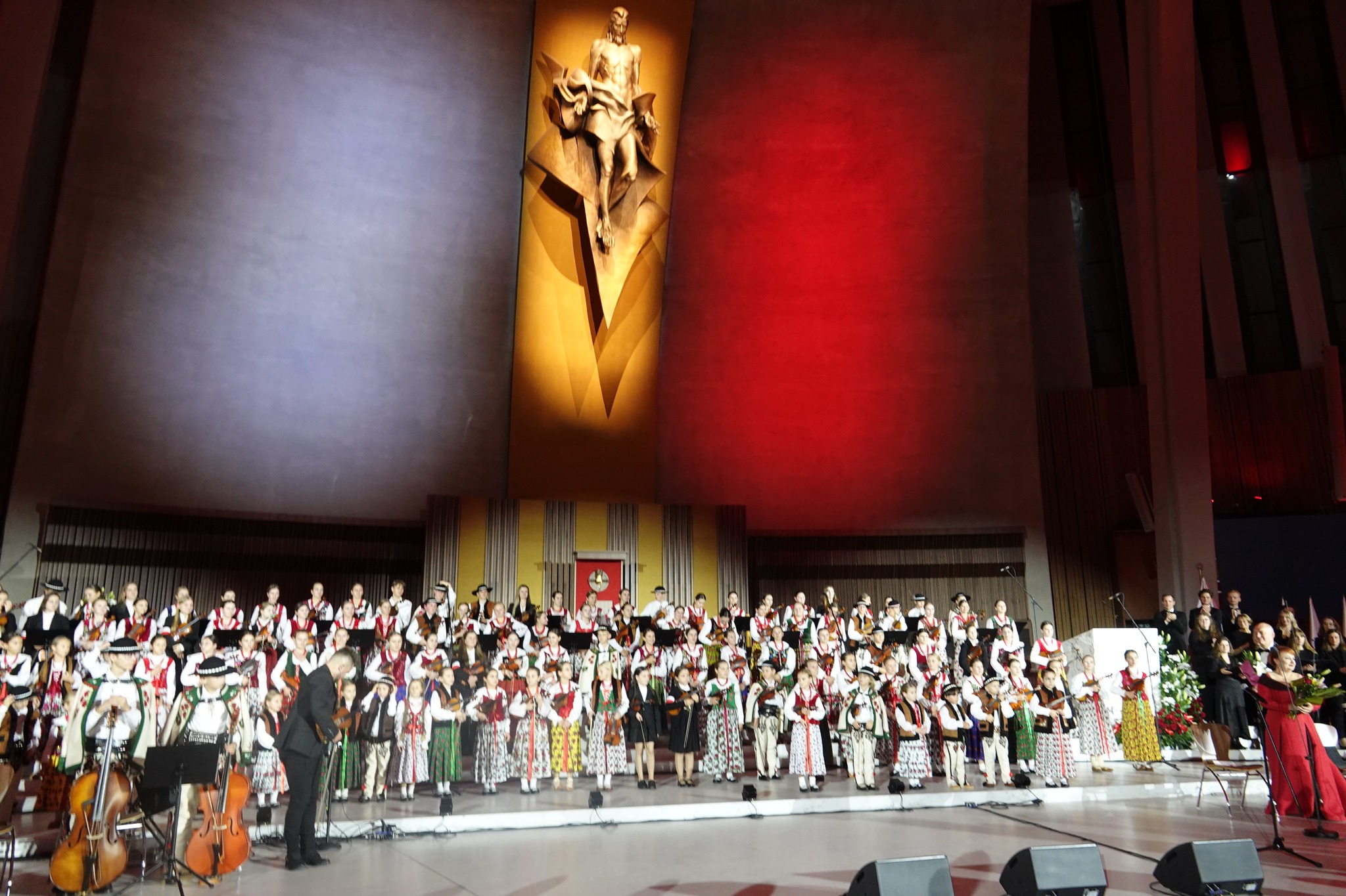 Mała Armia Janosika rozpoczęła koncert od wykonania znanego utworu Czerwonych Gitar “Płoną góry…” w nowej aranżacji. Następnie usłyszeliśmy wokalizę z towarzyszeniem orkiestry smyczkowej w wykonaniu wybitnej polskiej artystki Katarzyny Oleś-Blachy, reprezentującej – jak nadmienił we wstępie koncertu Przemysław Firek, prezes Fundacji Instytut Polskiej Kultury – “najwspanialszy sopran koloraturowy”. Kolejnym utworem była pieśń “Kiedy Góral umiera” w wykonaniu Małej Armii Janosika. Potem zabrzmiała najsłynniejsza aria operowa w naszym narodowym repertuarze: aria z kurantem z opery “Straszny dwór” Stanisława Moniuszki, którą wykonał “najwybitniejszy polski Stefan” – tenor Tomasz Kuk. “Barka” i “Słoneczko już zaszło” to kolejne dwie melodie, tak ukochane przez św. Jana Pawła II, w wykonaniu Małej Armii Janosika. Pieśń Moniuszki “Znaszli ten kraj” w interpretacji Katarzyny Oleś-Blachy poprzedziła liryczną pieśń “Panience na dobranoc” w wykonaniu małych artystów z Podhala.