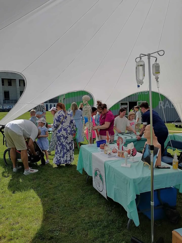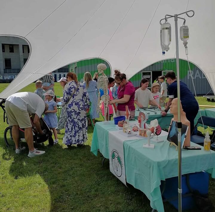 W namiocie medycznym można było założyć prawdziwe (sic!) lekarskie słuchawki i nasłuchiwać, jak bije serce rodzeństwa albo rodzica. Uczono się zakładać opatrunki pluszowemu misiowi, inny zaś (najwyraźniej w trakcie poważnej operacji) ujawniał kolejne organy, wyciągane z brzucha. Całości dopełniał całkiem „oswojony” szkielet, w którego szczęce brakowało wprawdzie jednego zęba, ale poza tym był całkiem kompletny…