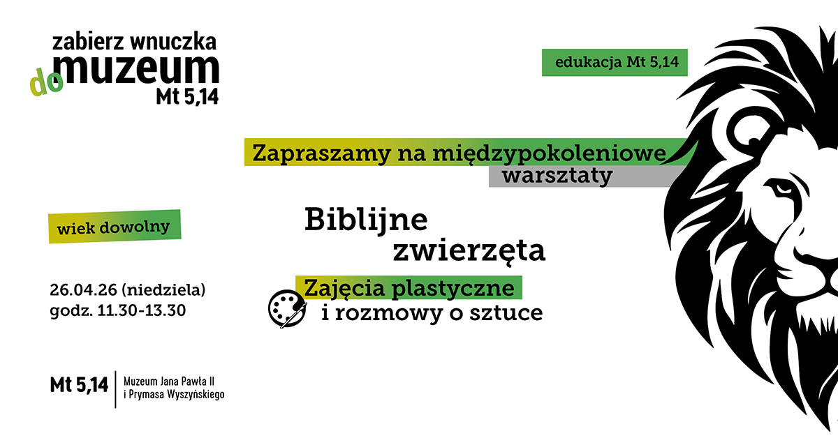 ← 16. rocznica katastrofy smoleńskiej Biblijne zwierzęta – warsztaty w Muzeum Wraz z Mt 5,14 | Muzeum Jana Pawła II i Prymasa Wyszyńskiego zapraszamy na kolejne międzypokoleniowe warsztaty. Tym razem będą one poświęcone biblijnej faunie. Więcej informacji na stronie Muzeum: https://mt514.pl/wydarzenia/biblijne-zwierzeta Podziel się: