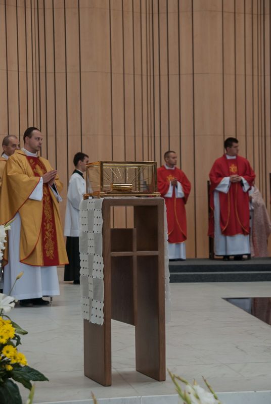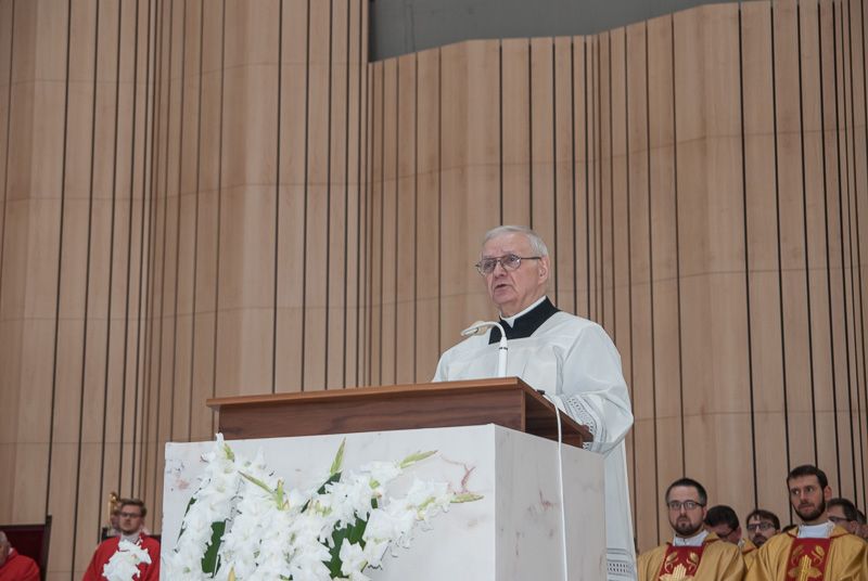Przywitał ich kustosz powstającego Sanktuarium ksiądz prałat Tadeusz Aleksandrowicz, przypominając dzień w którym wprowadzono do Świątyni relikwie błogosławionego księdza Jerzego i wyrażając nadzieję na to, że do pocztu polskich świętych i błogosławionych dołączy rychło Prymas Tysiąclecia. Zachęcał wszystkich do dziękczynienia i zawierzenia Opatrzności Bożej.