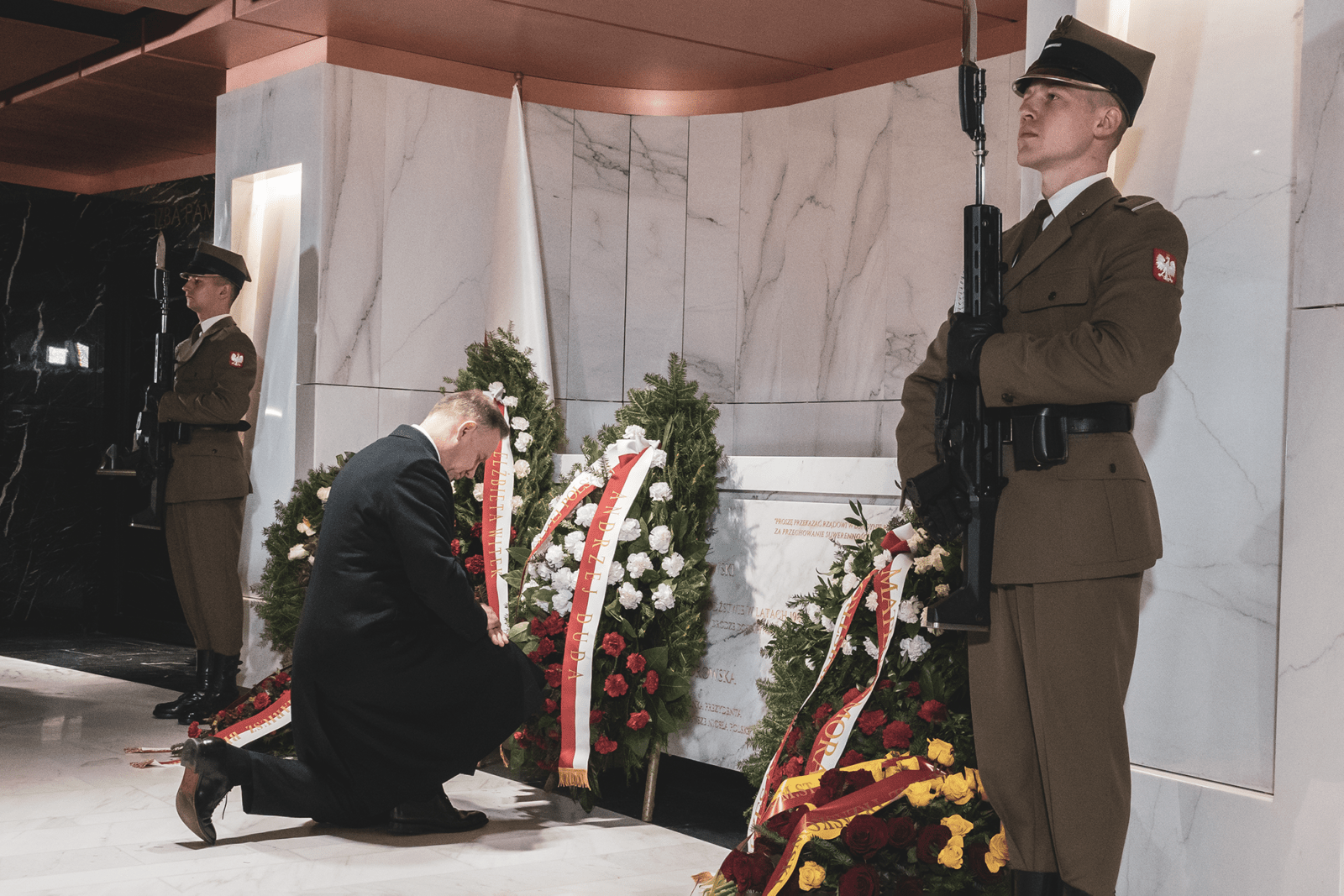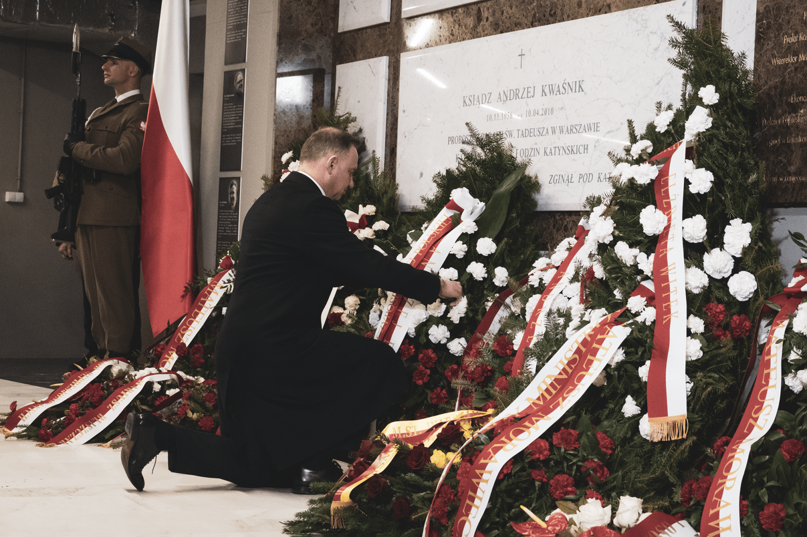 Prezydent RP Andrzej Duda złożył wieniec na grobach śp. Ryszarda Kaczorowskiego, śp. ks. Józefa Jońca, śp. ks. Zdzisława Króla i śp. ks. Andrzeja Kwaśnika oraz przy tablicy upamiętniającej ofiary katastrofy smoleńskiej.