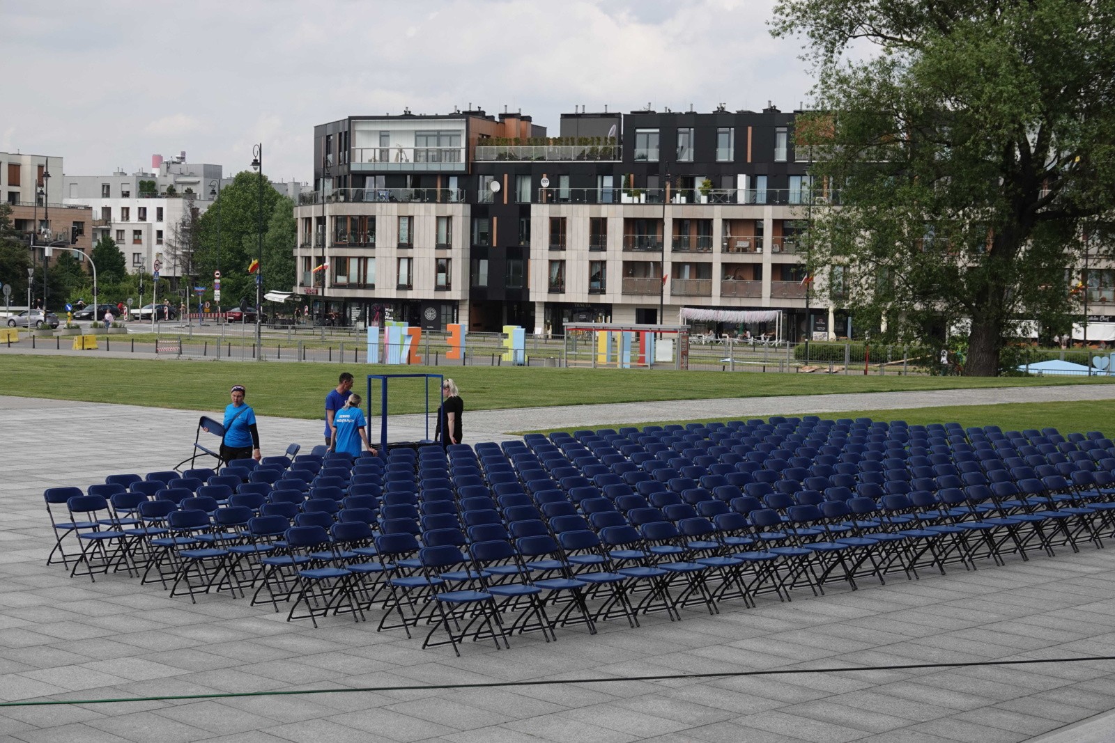 Rozstawiane są krzesła, na których będa mogli spocząć zmęczeni przejściem 12-kilometrowej trasy  pielgrzymi.