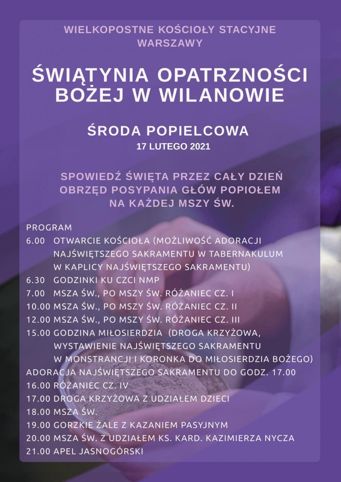 Środa Popielcowa, rozpoczynająca okres Wielkiego Postu wypada w tym roku 17 lutego. Tego dnia o godzinie 20.00 arcybiskup metropolita warszawski ksiądz kardynał Kazimierz Nycz odprawi w Świątyni Opatrzności Bożej Eucharystię i wygłosi homilię. Podczas Mszy Świętej odbędzie się obrzęd posypania głów popiołem, wprowadzający w czas przygotowań do Zmartwychwstania Chrystusa.