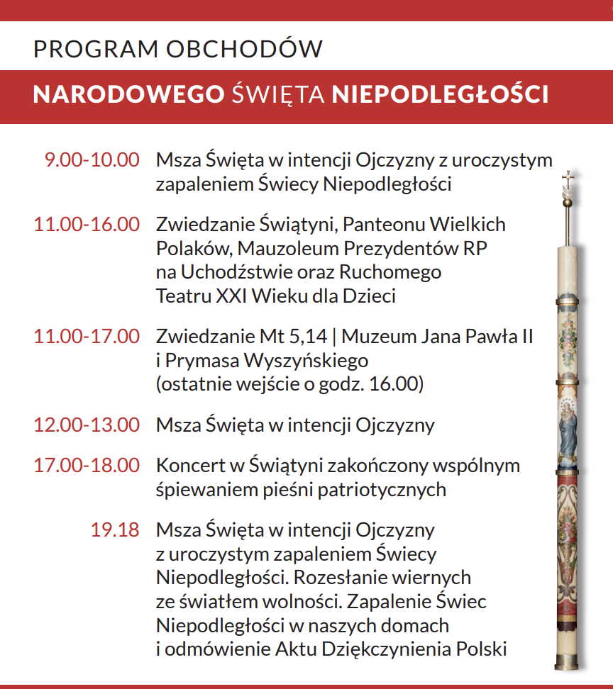 Centralnym punktem tegorocznych obchodów 107. rocznicy odzyskania niepodległości w Świątyni Opatrzności Bożej będzie Eucharystia sprawowana o godz 9.00 w intencji Ojczyzny. Towarzyszyć jej będzie obrzęd uroczystego zapalenia Świecy Niepodległości. Zachęcamy do składania intencji.