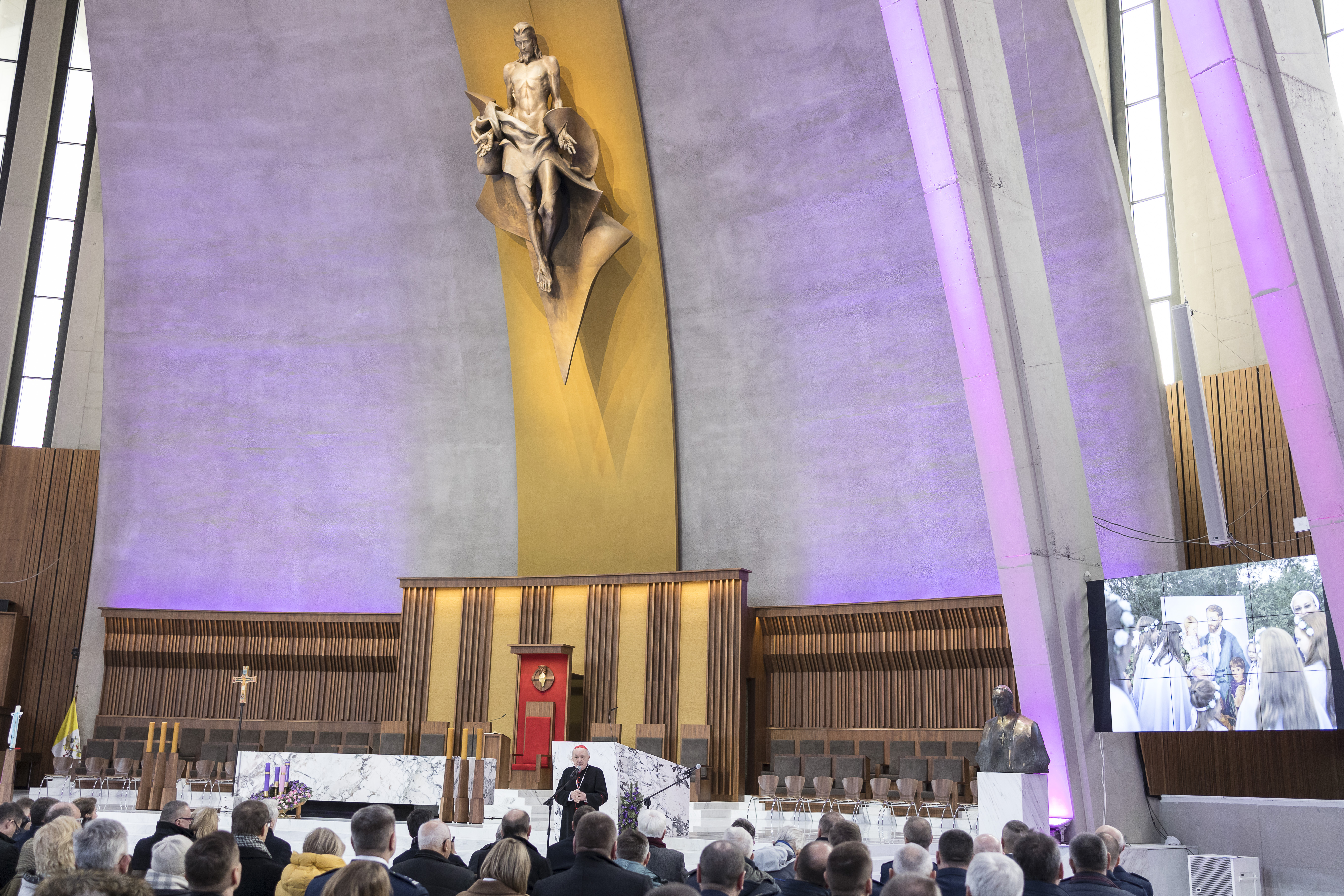 Następnie pan Piotr Gaweł podsumował tegoroczne prace budowlane w Świątyni. W tym roku zostały zrealizowane dodatkowe stalle w prezbiterium, wstawiono nowe świeczniki oraz rzeźby św. Jana Pawła II i bł. kardynała Stefana Wyszyńskiego autorstwa profesora Myjaka. W całej Świątyni Opatrzności Bożej została także wyszlifowana posadzka. Udoskonalono także w tym roku infrastrukturę nagłośnieniową i oświetleniową.