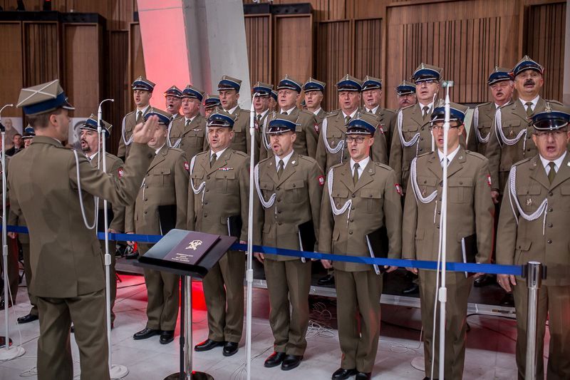 Do Świątyni wkroczył poczet Sztandarowy Wojska Polskiego. Chór Reprezentacyjny WP wraz z wiernymi wypełniającymi po brzegi wnętrze Wotum Narodu oraz duchownymi koncelebrującymi liturgię odśpiewał Hymn Narodowy.
