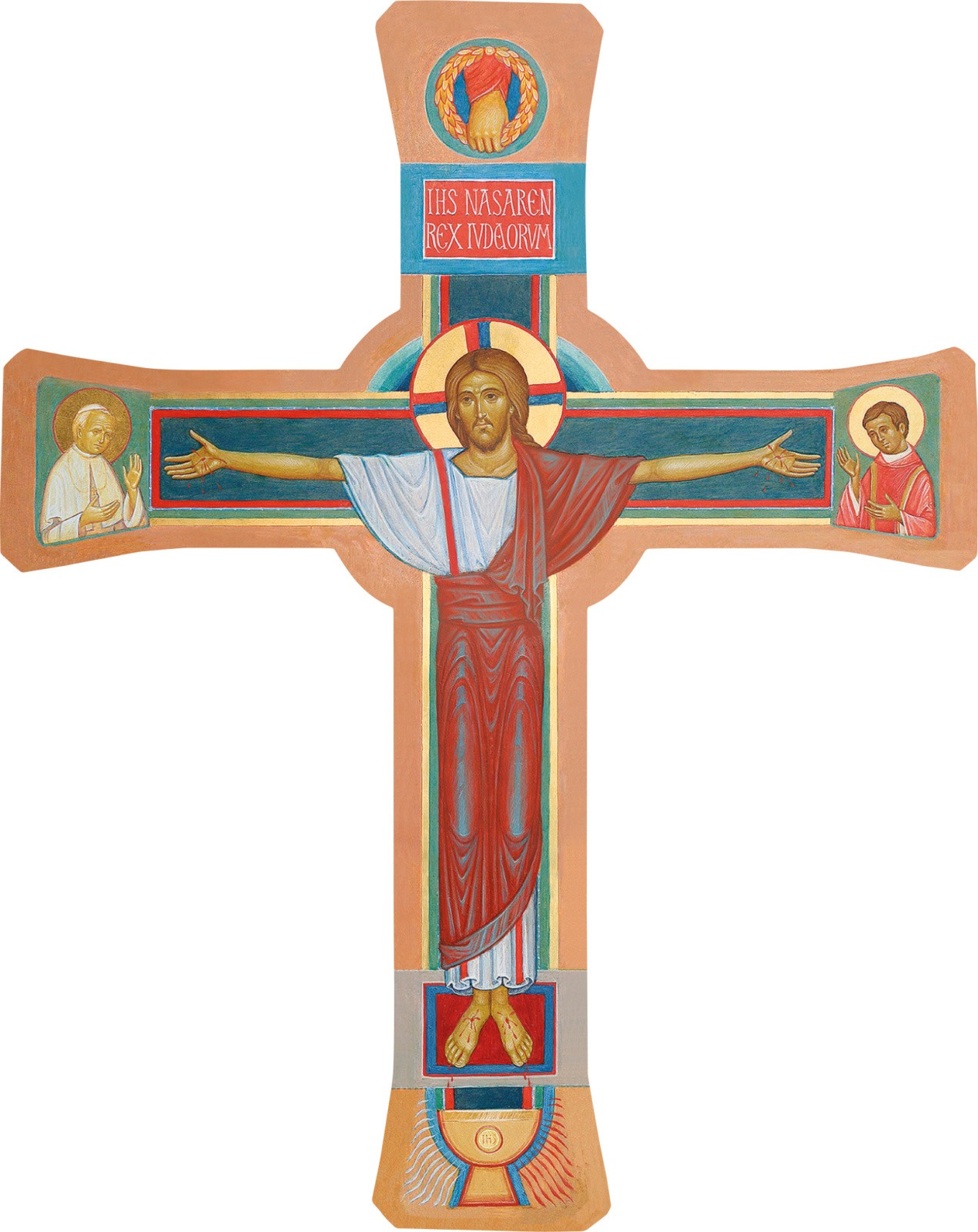 Kielich u stóp krzyża przypomina o Eucharystii, a otaczające go promienie symbolizują krew i wodę wypływającą z przebitego boku Chrystusa.