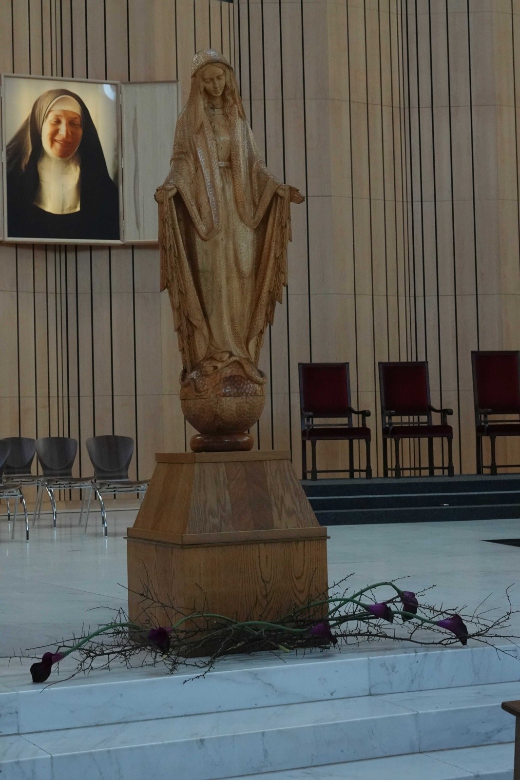 Ciernie splecione z kwiatami złożono również pod figurą Tej, która podczas ofiarowania Chrystusa w świątyni usłyszała od Symeona proroctwo A Twoją duszę miecz przeniknie…