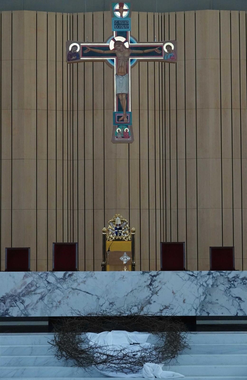 U stóp ołtarza, na którym stoi relikwiarz z Drzewem Krzyża Świetego spoczywa ogromna, spleciona z cierni korona.